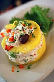 Layered mashed yellow potatoes with lime and ají amarillo, stuffed with chicken salad and vegetables. 🌱 Vegan option available (please add a comment to your order).